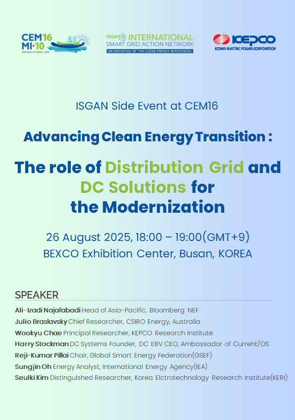 At the 16th Clean Energy Ministerial (CEM16) in Busan, Republic of Korea, ISGAN will host a side event titled “The Role of Distribution Grids and DC Solutions for Modernisation.”