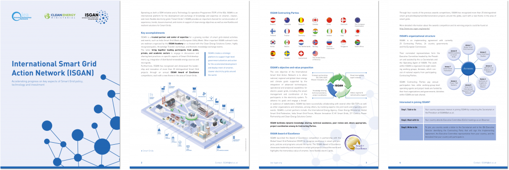 The brochure covers on the one side the key accomplishments and the contracting parties of ISGAN but also the objective, value proposition and organizational structure of ISGAN. In particular, the brochure also provides a one-page overview of the objectives and current activities for each individual Annex.