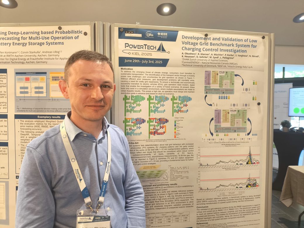 At the conference, Dr Obusevs presented two posters. The first of them showed the progress of VEHICLE (Validation of bEnchmark system for cHargIng ControL in-vEstigation), which was developed in collaboration with SIRFN partners from the Technical University of Denmark (DTU) (Denmark), RSE (Italy), the University of Strathclyde (UK), and Natural Resources Canada (Canada). Led by ZHAW and supported by DTU’s SYSLAB infrastructure, the researchers created, validated and combined a set of components that make it possible to work with topologies.