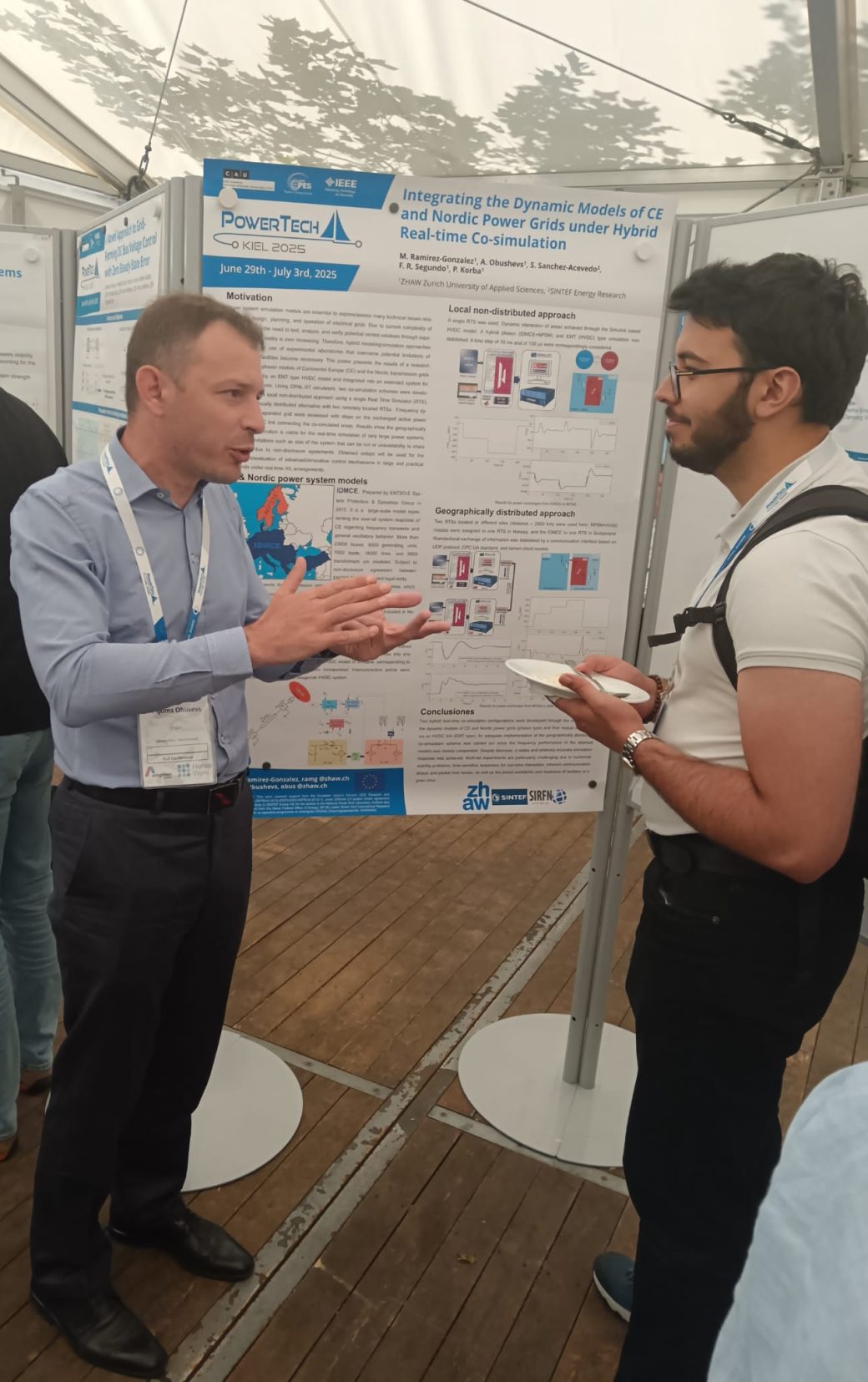 The second poster was created in collaboration with Scandinavian partners from SINTEF Energy Research and explores geographically distributed coupling between two bulk power systems. By combining the initial dynamic model of continental Europe (IDMCE) with the Nordic power system model (NPSM) and a corresponding high-voltage direct-current (HVDC) interconnection, three real-time implementation schemes were developed using OPAL-RT simulators.