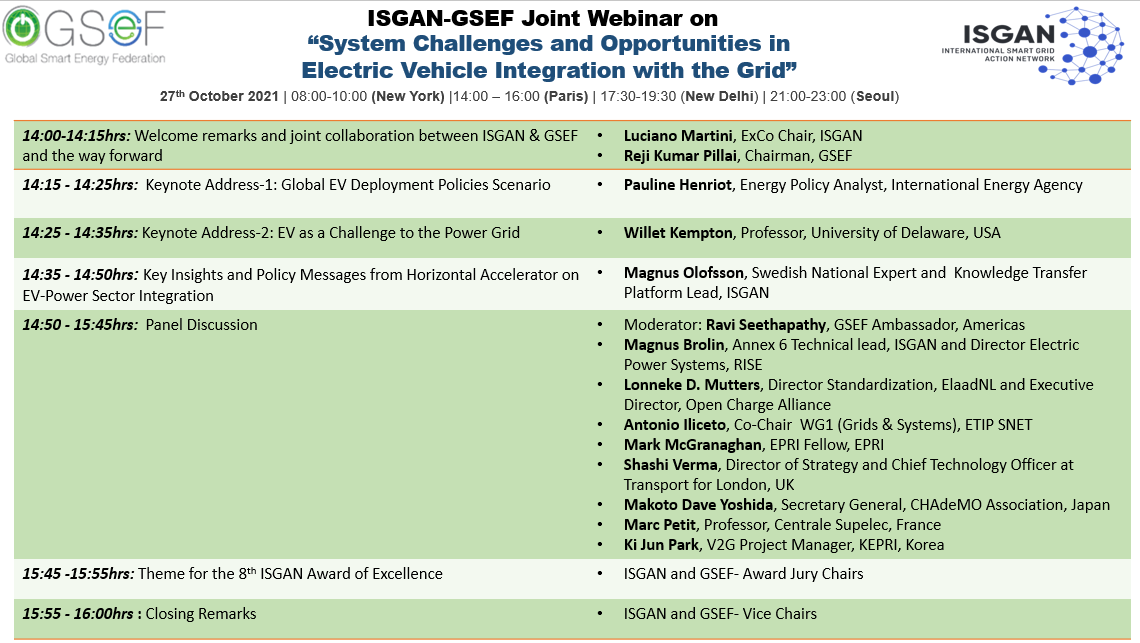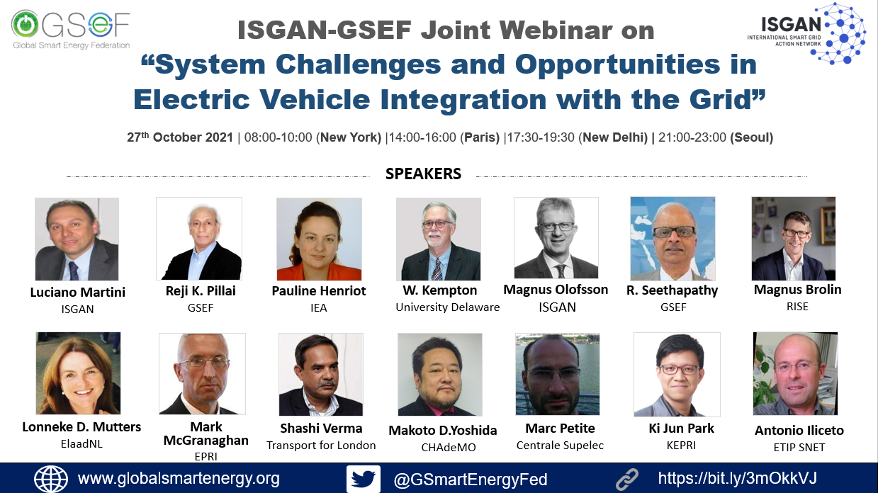 This open event will bring together ongoing and upcoming ISGAN and GSEF’s work looking at EV integration. The discussion will focus on essential policy support, technical issues of EV, and cross-sectoral approaches.